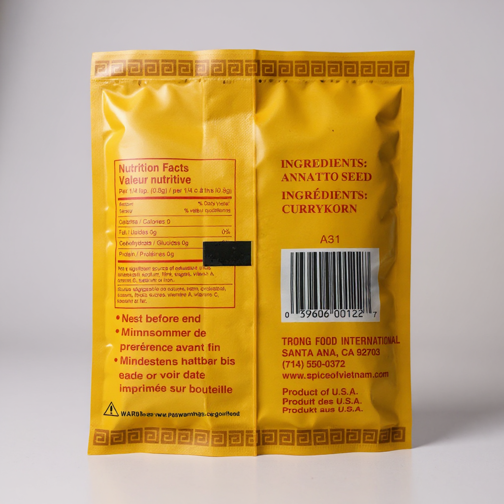 Gói này chứa hột điều màu, một loại gia vị được sử dụng rộng rãi trong nấu ăn như một chất tạo màu tự nhiên, giúp món ăn có màu đỏ cam đẹp mắt. Chúng là thành phần thiết yếu để tạo màu sắc rực rỡ cho nhiều món ăn Việt Nam và các món ăn Đông Nam Á khác.