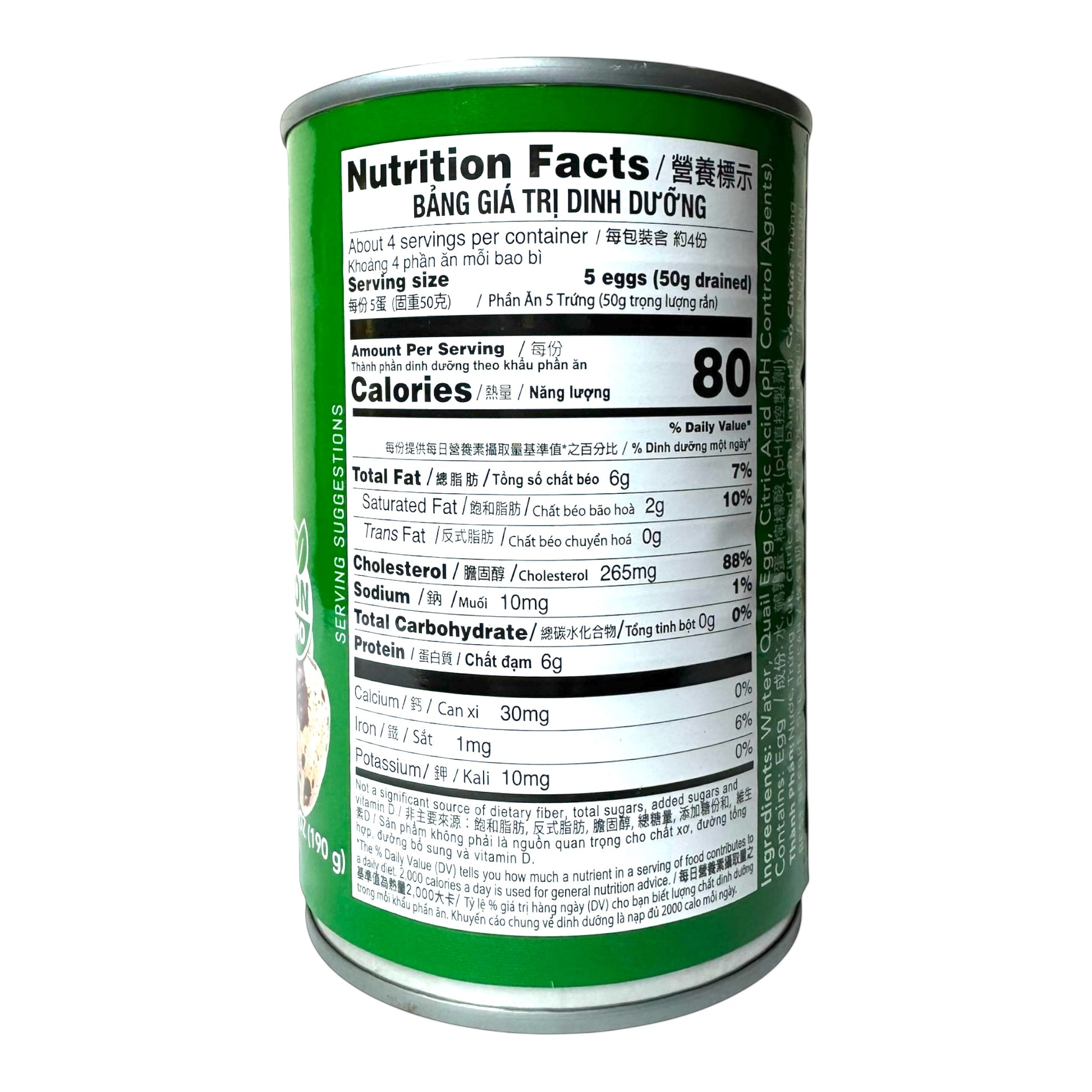This can contains peeled quail eggs packed in water. The eggs are a rich source of cholesterol and protein. They can be used to prepare a variety of dishes such as noodle soups, stews, or salads. They can also be eaten on their own as a snack.
